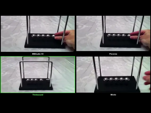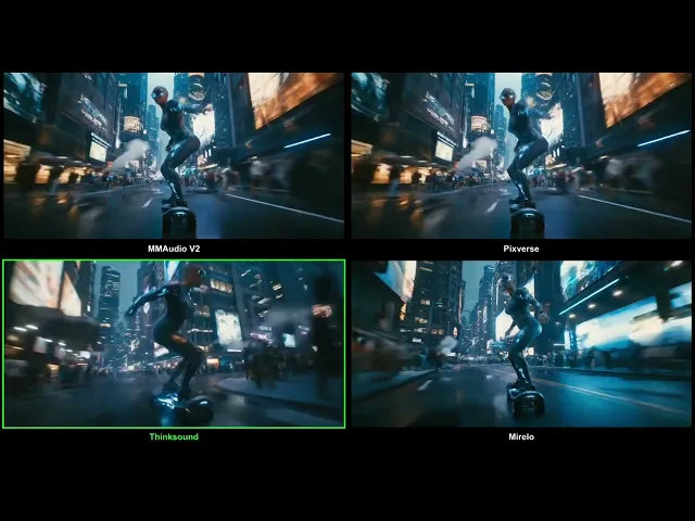 Competitors often struggle with unwanted artifacts like music or speech, particularly on synthetic videos (see, e.g., examples 1 and 2 below). Mirelo SFX also excels at creating realistic effects across a multitude of scenes when alternative models default to unrelated or unnatural sounds (see examples 2 and 3 below).